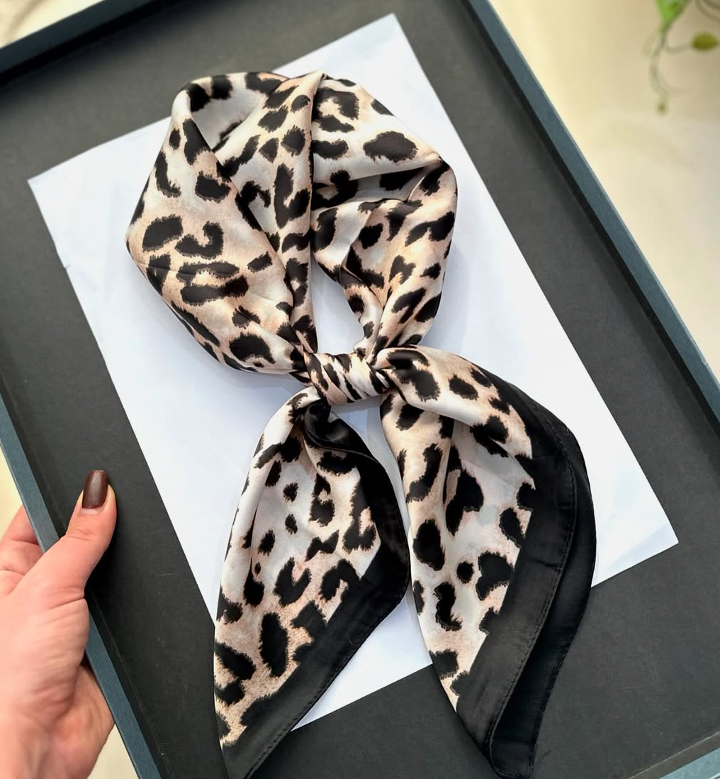 مینی اسکارف ابریشم سیلک زنانه پلنگی حاشیه مشکی