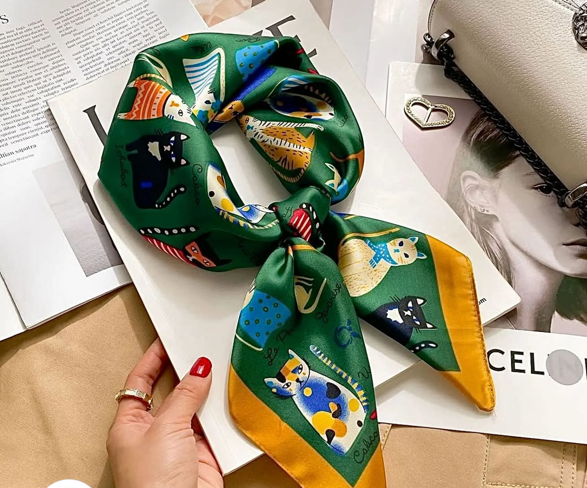 مینی اسکارف ابریشم سیلک زنانه مدل گربه سبز