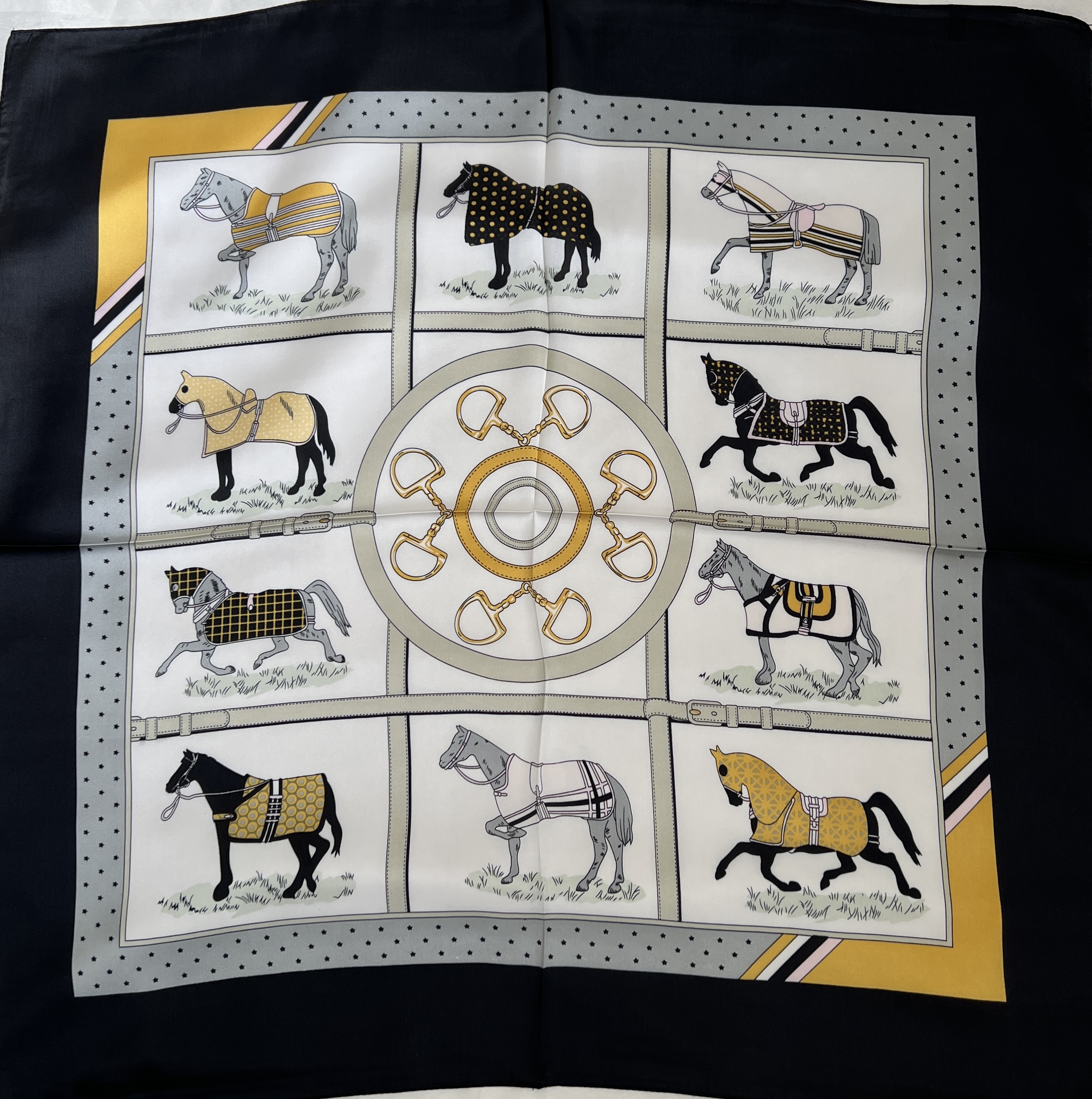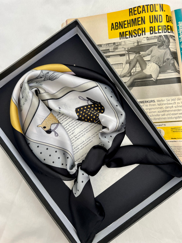 مینی اسکارف ابریشم سیلک زنانه مدل اسب حاشیه مشکی خردلی